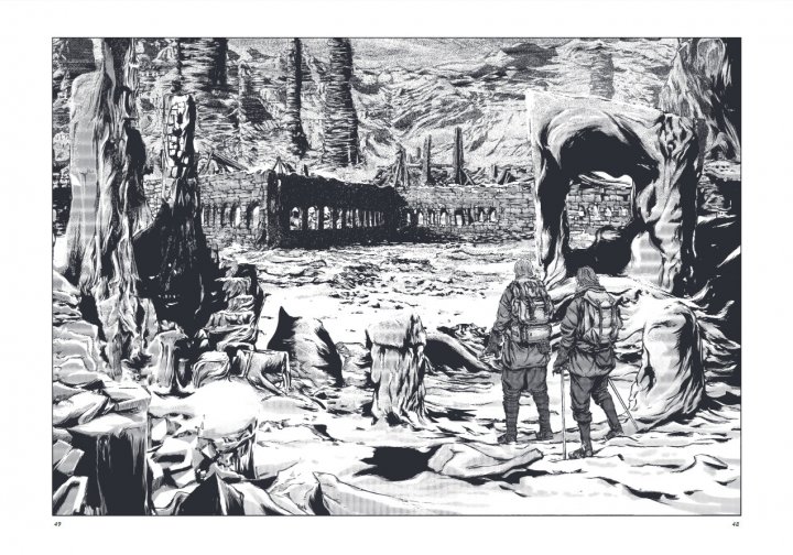 A la fin du premier tome, nous avons laissé nos héros, le professeur Dyer et son assistant Danforth, aux portes du mystère de ces prodigieuses montagnes. Pour ceux qui connaissent la formidable nouvelle de Lovecraft, c’est bien là que devait se situer la grande difficulté de cette adaptation, à savoir donner une version graphique convaincante à la prodigieuse cité qu’allaient découvrir les personnages. Sans parler des créatures nouvelles à mettre en image.